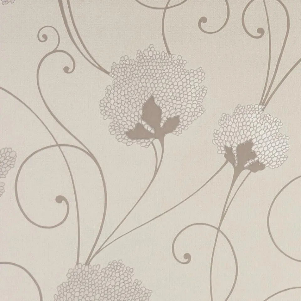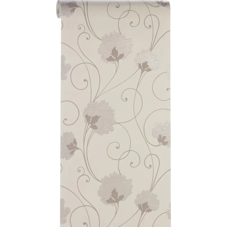 Vliesbehang beige met glitterend bloemen dessin. Normaal afwasbaar. Voorzien van het FSC-keurmerk. Plakken met Perfax Roll-On. 10 meter per rol.