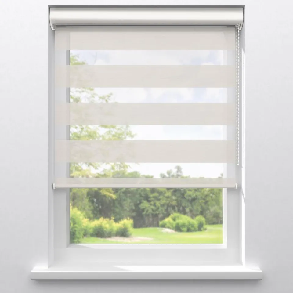 Lichtdoorlatend duo-rolgordijn off-white met streep dessin. De transparante banen hebben een grovere gaasstructuur. De afwisselende open en dichte stofbanen bewegen voor elkaar langs. Zo bepaal je eenvoudig de lichtinval en privacy. Je kunt zelf de kleur kiezen van de cassettes, eindkappen, kettingen, onderlatten en roedes. De bedieningszijde kies je ook zelf: rechts of links. Op maat te maken en eenvoudig met de juiste afmetingen te bestellen.