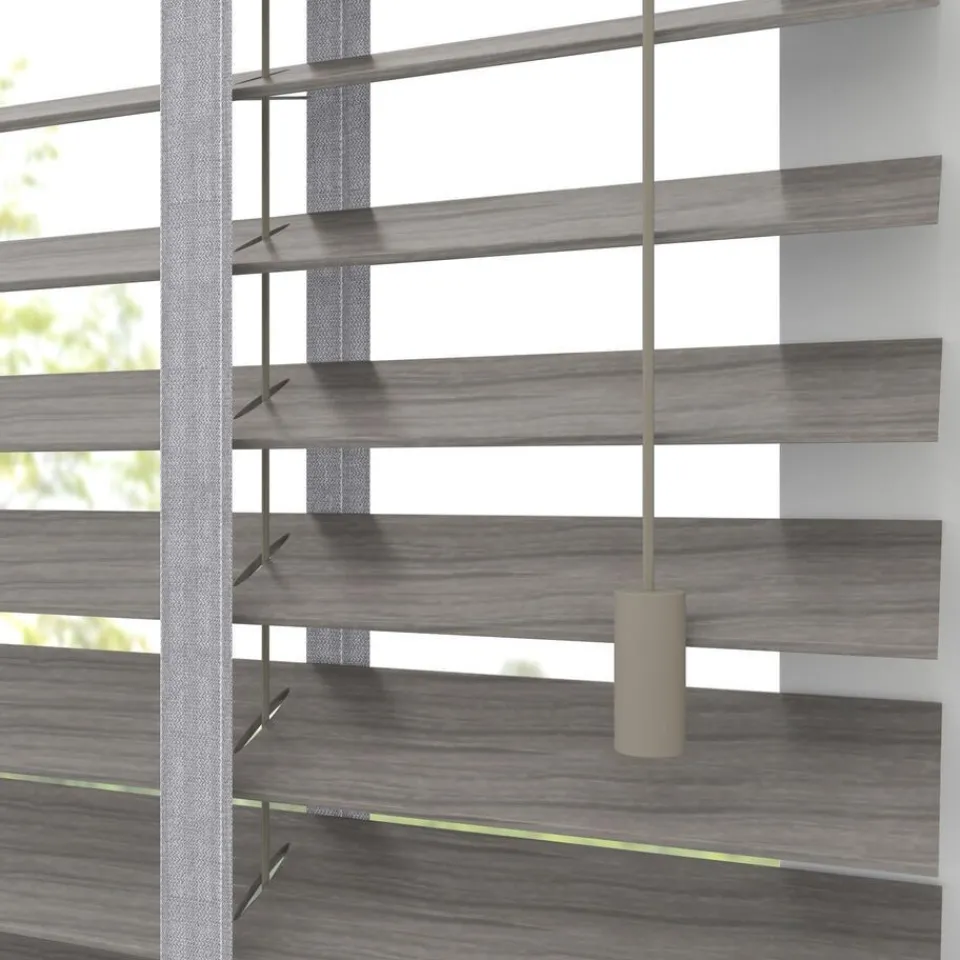 Houten jaloezie lichtgrijs met natuurlijke houtnerven en luxe uitstraling. 100% hout. De brede lamellen van 50 mm zorgen voor veel lichtinval en bieden veel privacy wanneer je deze sluit. Op maat te maken en volledig naar wens samen te stellen. Bepaal zelf de bedieningszijde en kies uit diverse accessoires en uitvoeringen. Keuze uit een bijpassend ladderkoord, 48 verschillende ladderbanden en een koordhanger van hout, rvs of zwart metaal.