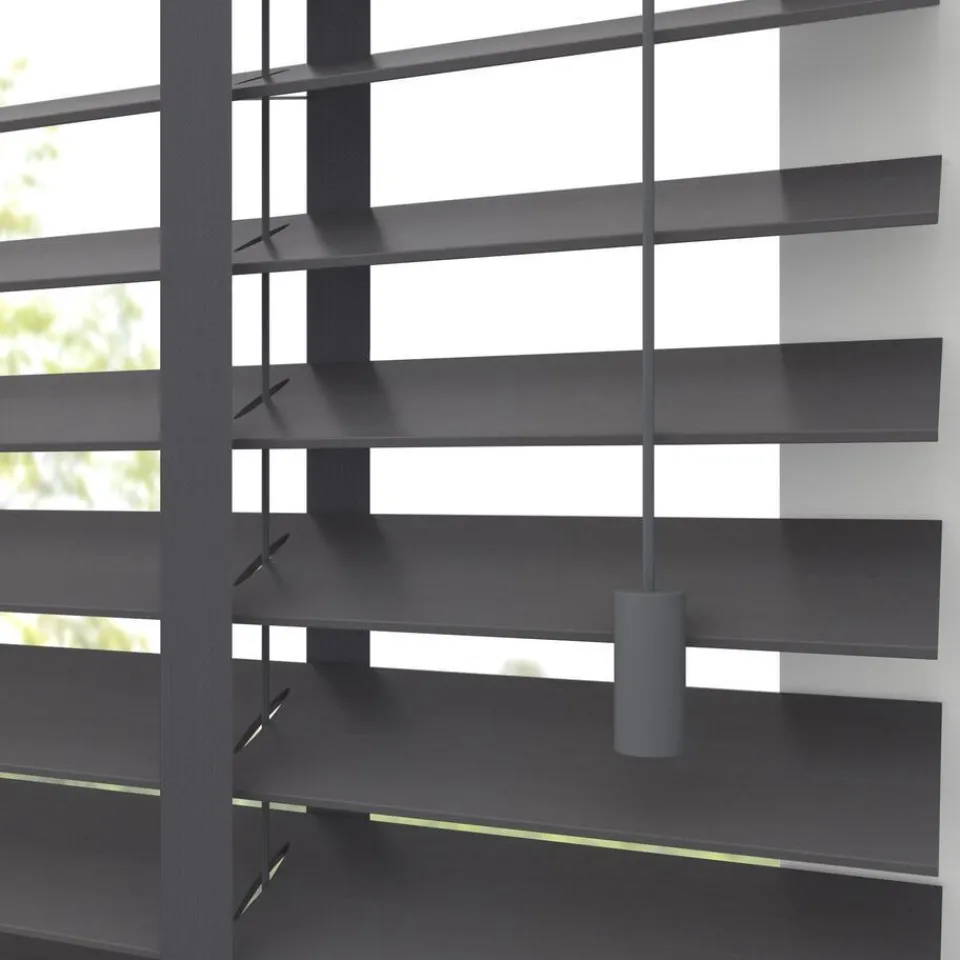 Houten jaloezie donkergrijs met een klassieke uitstraling. 100% hout. De brede lamellen van 50 mm zorgen voor veel lichtinval en bieden veel privacy wanneer je deze sluit. Op maat te maken en volledig naar wens samen te stellen. Bepaal zelf de bedieningszijde en kies uit diverse accessoires en uitvoeringen. Keuze uit een bijpassend ladderkoord, 48 verschillende ladderbanden en een koordhanger van hout, rvs of zwart metaal.
