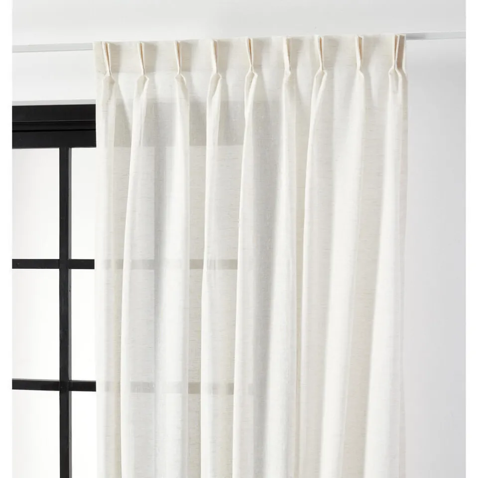 Inbetween Nola in de kleur offwhite. Gemaakt van 85% polyester en 15% linnen. Kamerhoog, kamerkant glans en buitenkant raam mat, dubbele onderzoom. Machinewasbaar op 30 graden. Kan niet in de droger. Prijs per strekkende meter. 300cm hoog.