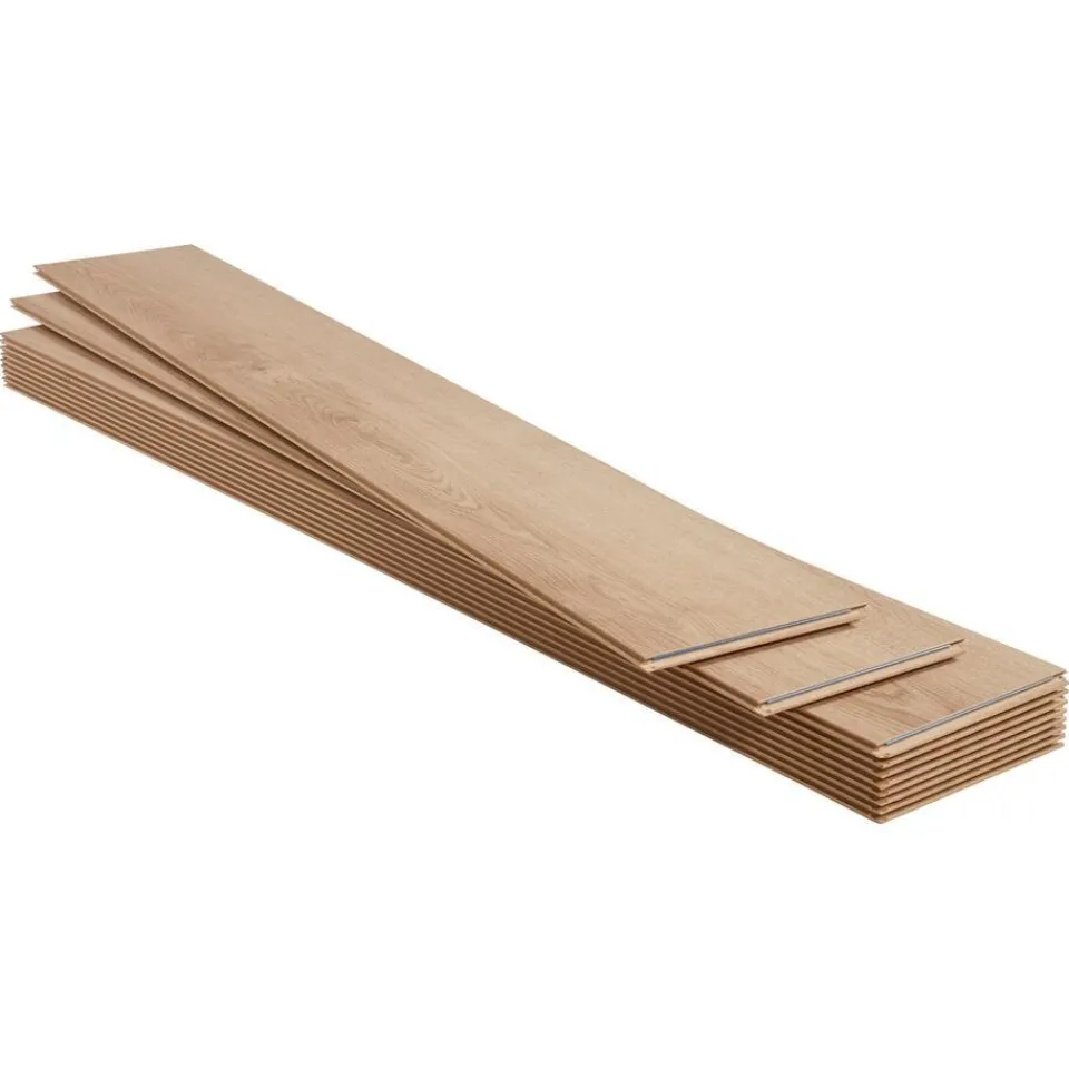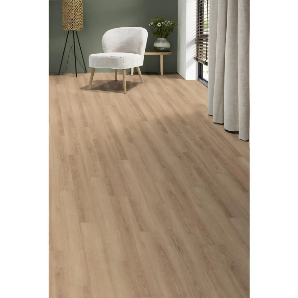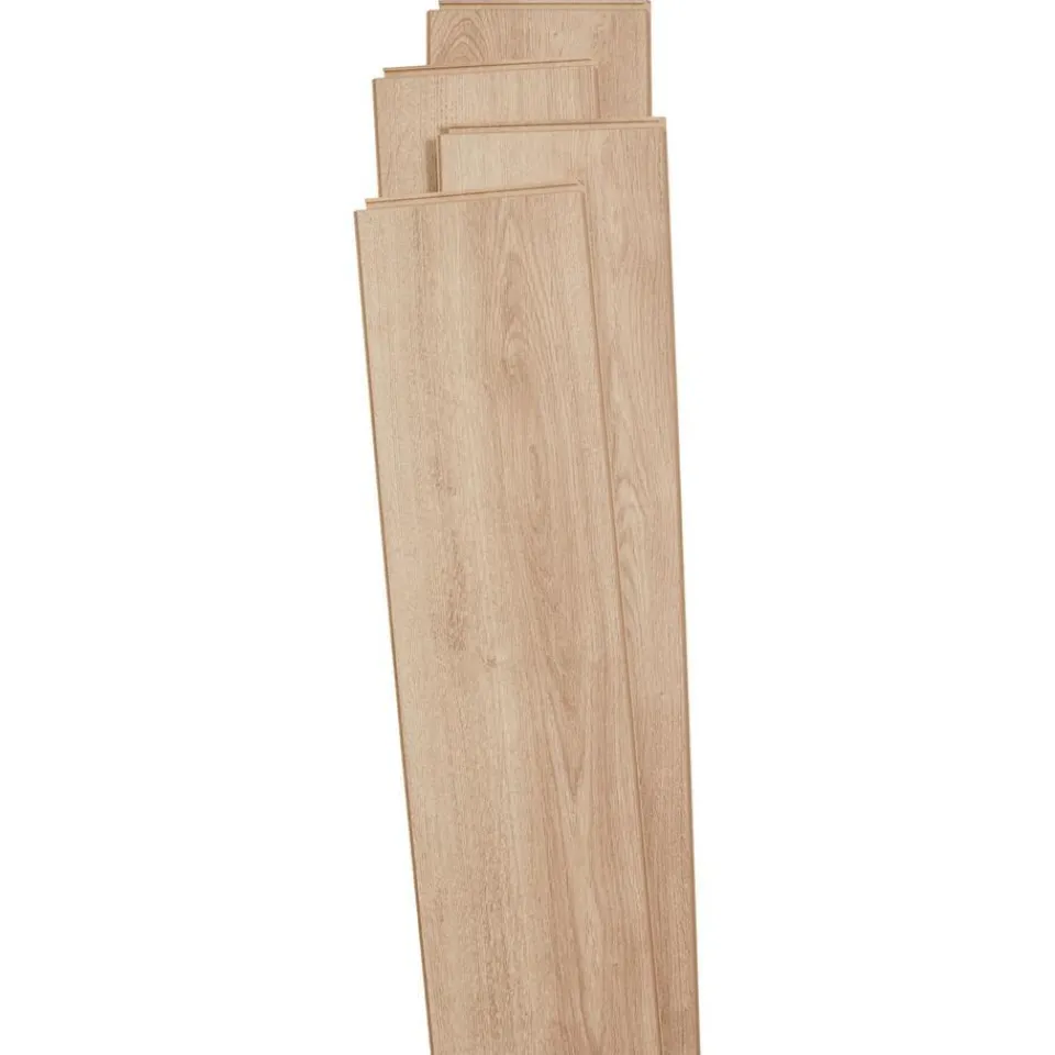 Laminaat Hunt met een dikte van 7 mm en een 4-zijdige V-groef. Inhoud per pak: 2,25 vierkante meter. Kleur: eiken.
