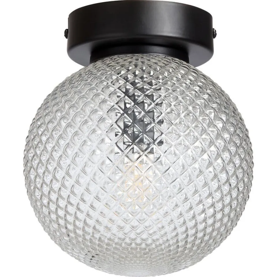 Ronde plafondlamp van wit glas met structuur en zwart metalen afwerking. Kleine fitting E14. 15 cm doorsnede.