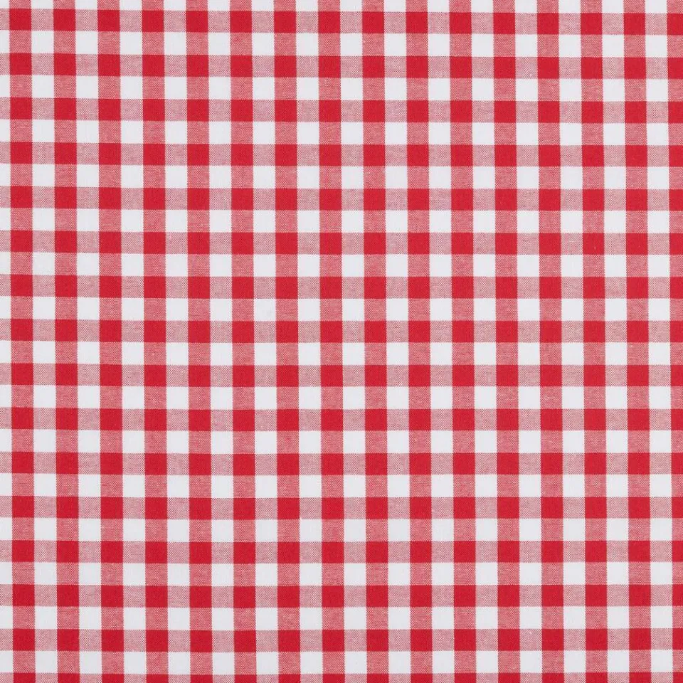 Stof met rood geruite opdruk. Stevig en slijtvast. Ook geschikt voor het maken van gordijnen.140 cm breed.