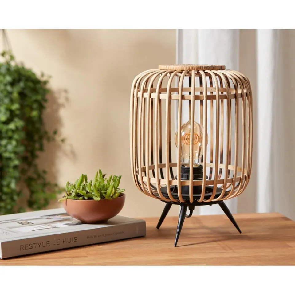 Tafellamp van Bamboe met een zwarte voet. Fitting groot E27, exclusief. Afmeting 21×31 cm (dxh).