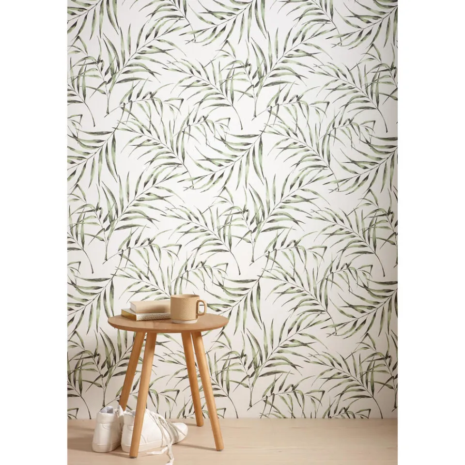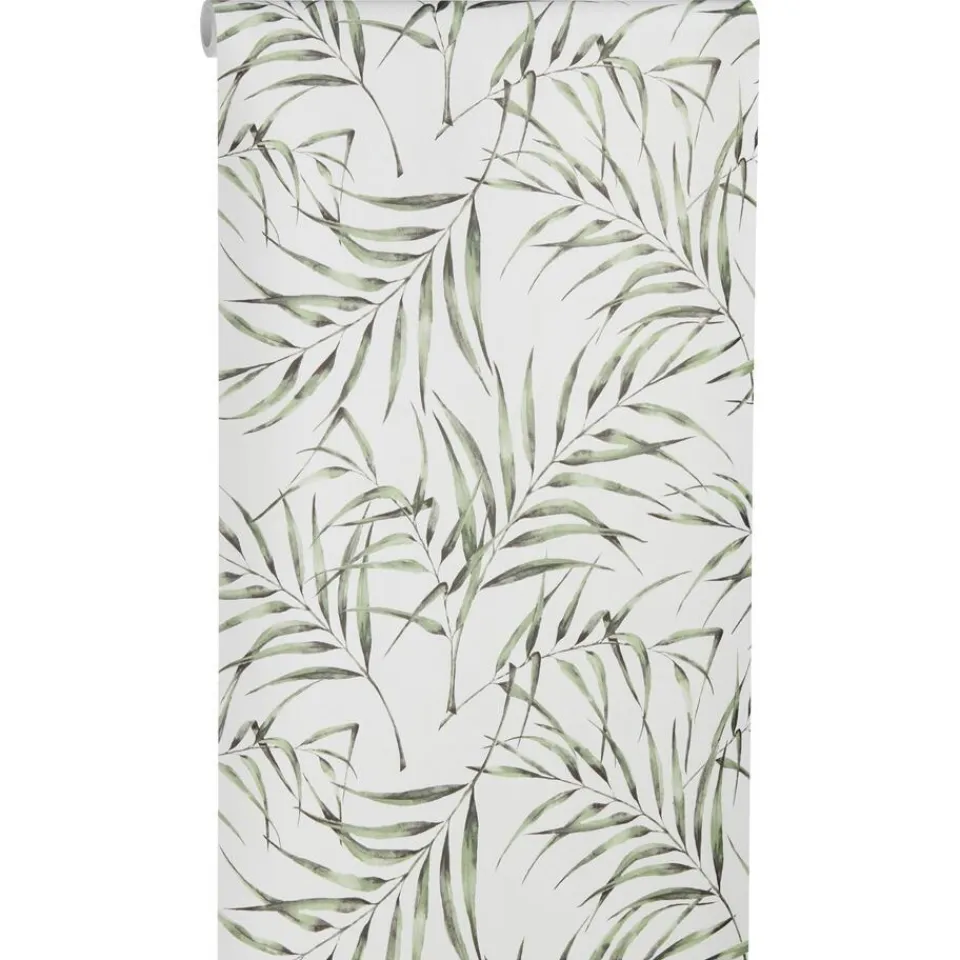 Vliesbehang met groene botanische print.