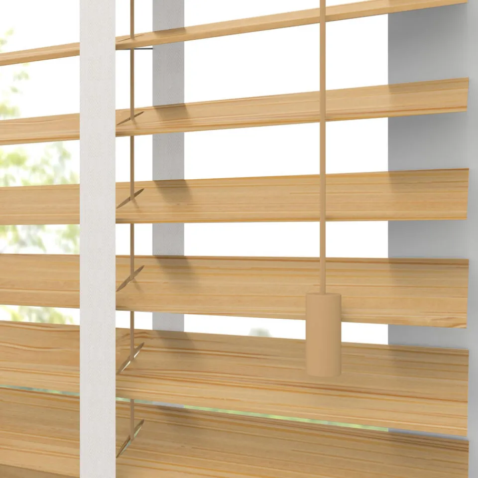 Houten jaloezie honingkleurig met bamboe structuur en natuurlijke uitstraling. 100% FSC bamboe. De brede lamellen van 50 mm zorgen voor veel lichtinval en bieden veel privacy wanneer je deze sluit. Op maat te maken en volledig naar wens samen te stellen. Bepaal zelf de bedieningszijde en kies uit diverse accessoires en uitvoeringen. Keuze uit een bijpassend ladderkoord, 48 verschillende ladderbanden en een koordhanger van hout, rvs of zwart metaal.