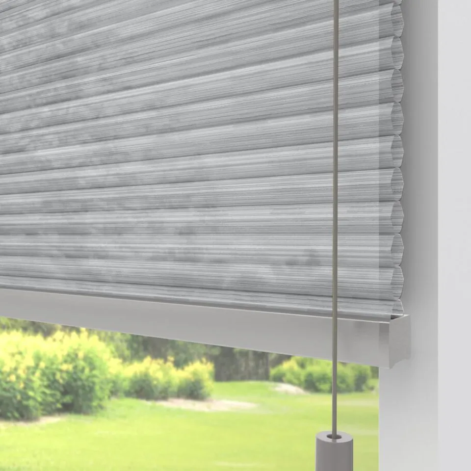 Lichtdoorlatende dubbele plissé lichtgrijs met streeppatroon met witte achterzijde. Dit mooie dubbele plissé gordijn heeft de hoogste isolatiewaarde. Het heeft een honingraatstructuur die een stilstaande luchtlaag creëert, dit zorgt voor een isolerende werking. Het zorgt ervoor dat de warmte binnen blijft als het buiten koud is en andersom. De aluminium coating aan de binnenzijde, levert de meeste energiebesparing op. Voor een isolerende werking kun je ook denken aan een combinatie tussen plisségordijnen en een overgordijn. De koorden zijn verwerkt in de honingraat en zijn niet zichtbaar. Verkrijgbaar als top down, top down bottom up of top down bottom up gespannen. Een top down bottom up gordijn kan zowel aan de bovenkant als de onderkant worden uitgevouwen voor volledige controle over de gewenste lichtinval en privacy. Een gespannen plissé is zeer geschikt voor draaikiepramen omdat de stof goed op zijn plek blijft. Op maat te maken en volledig naar wens samen te stellen. Bepaal zelf de kleur van het systeem en kies uit een bijpassende koordhanger van kunststof, rvs of zwart metaal.