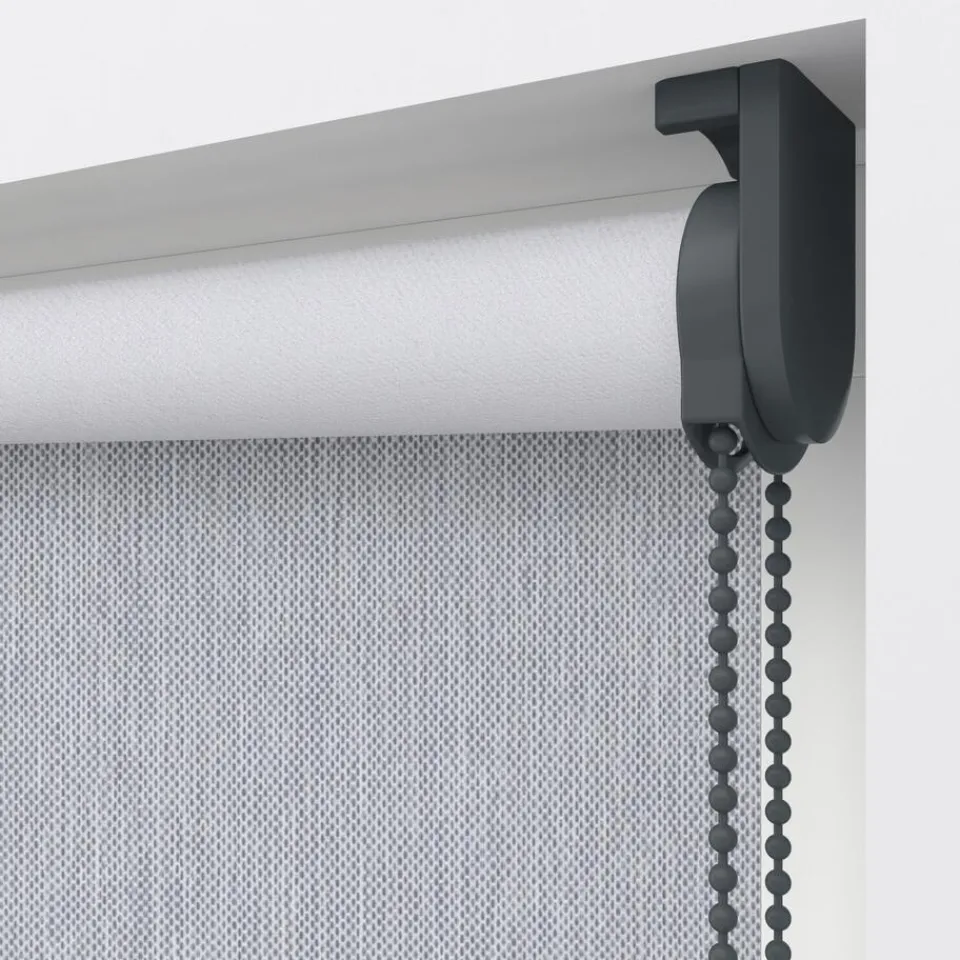 Verduisterend rolgordijn lichtgrijs gemêleerd met verticale garens. De witte achterzijde zorgt voor volledige verduistering. Ideaal voor slaapkamers maar ook te gebruiken voor keukens en andere woonruimtes. Op maat te maken en volledig naar wens samen te stellen met een ruime keuze uit accessoires en uitvoeringen. Elektrische bediening en zijgeleiding is mogelijk. Ook geschikt voor draaikiepramen. Eenvoudig met een vochtige doek af te nemen.