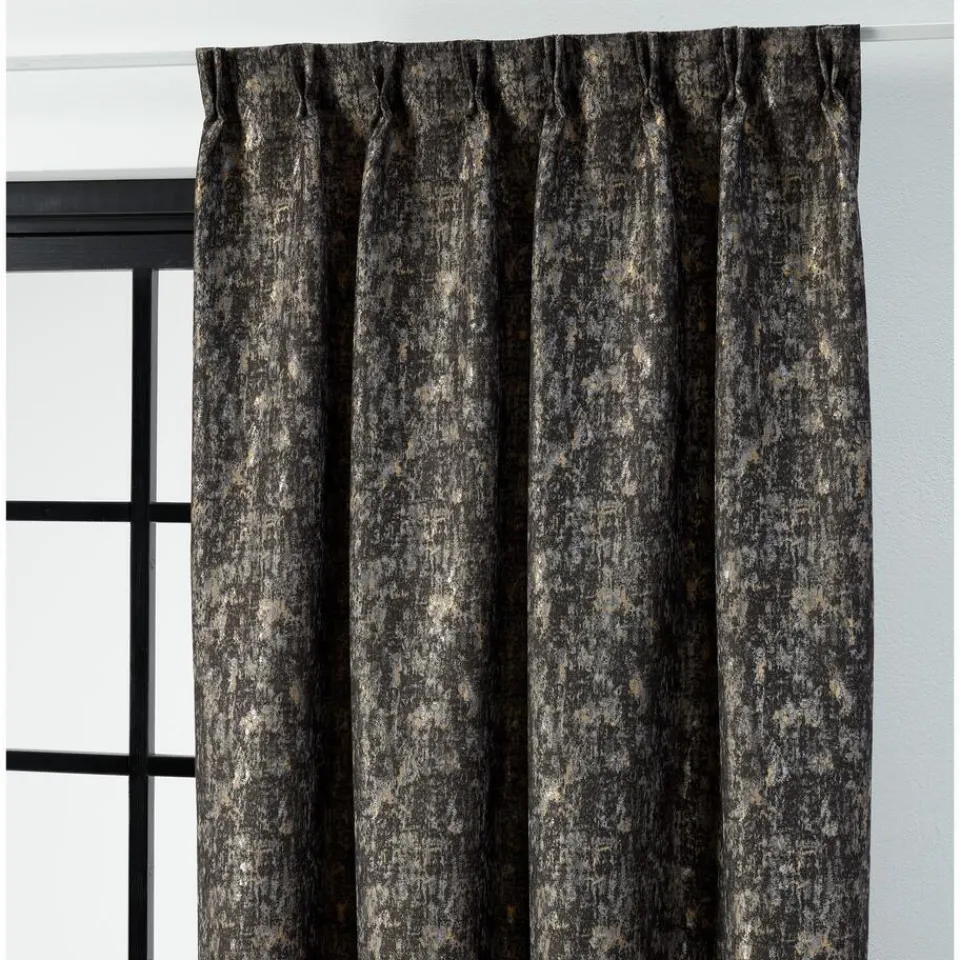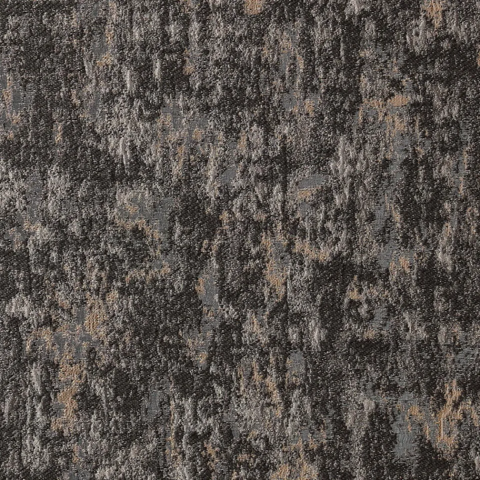 Lichtdoorlatende jaquard gordijnstof zwart met een verweerde metallic print. Stevig, vormvast en slijtvast. 145 cm breed.