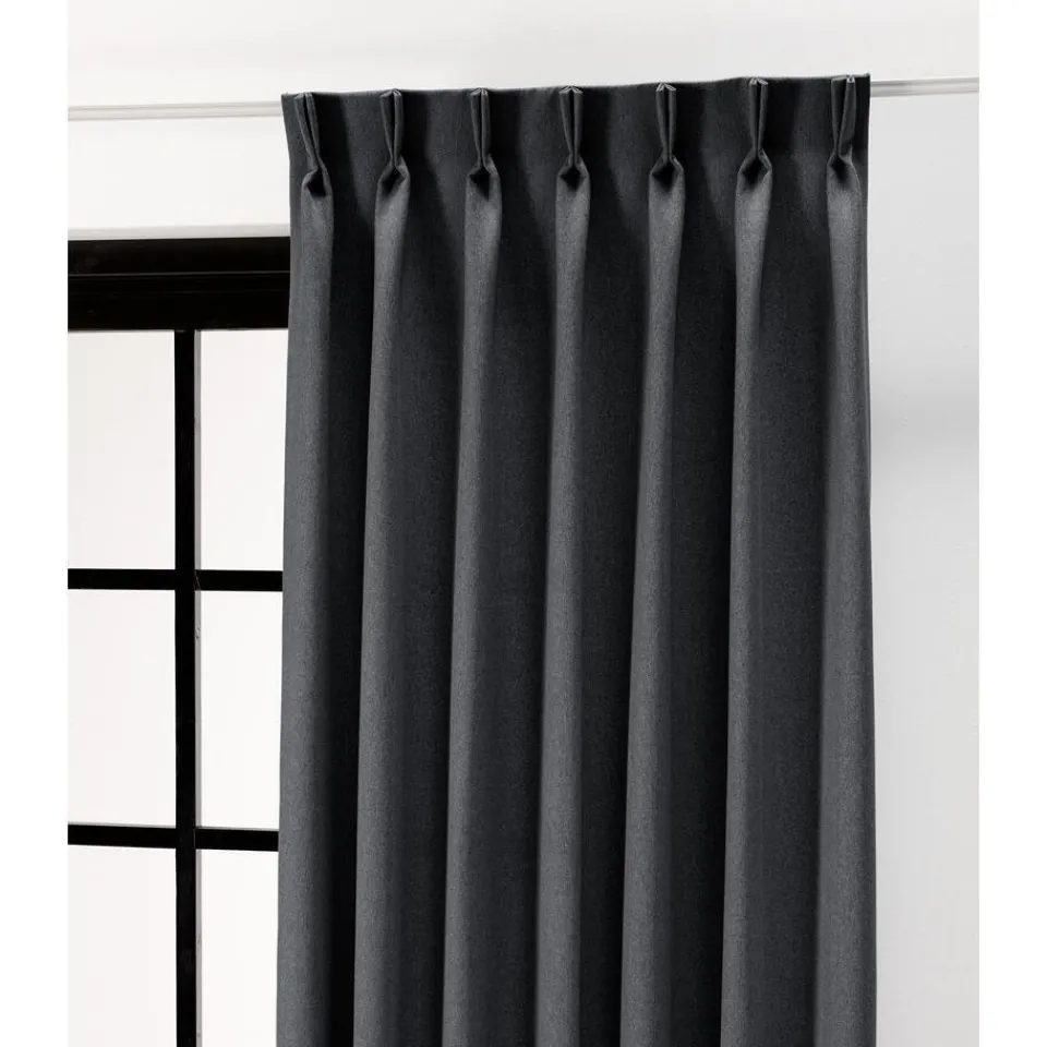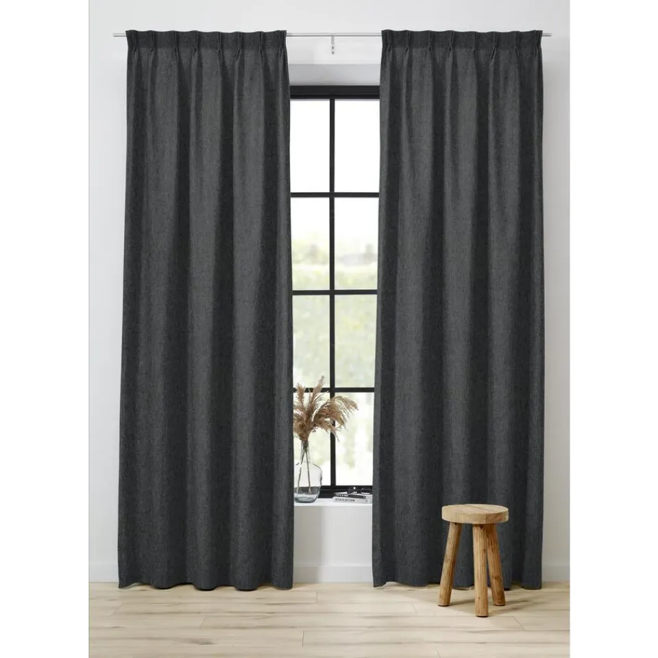 Gordijnstof antracietkleurig van gemêleerde stof. Soepelvallend, stevig en kreukherstellend. 146 cm breed.