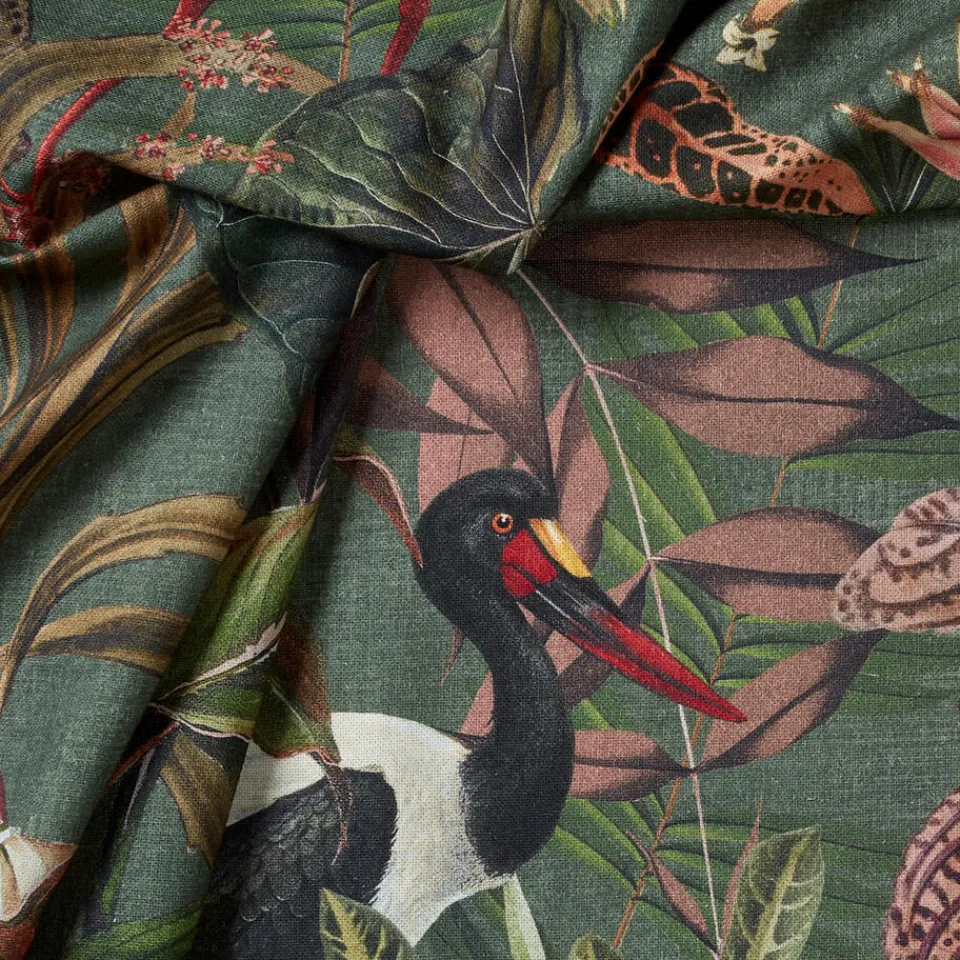 Gordijn Moniek in een groene kleur met een tropische print. Gemaakt van 100% katoen. 140 cm breed.