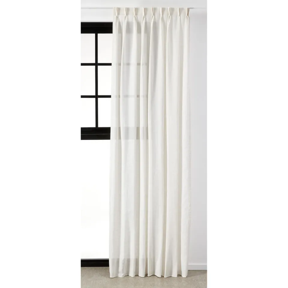 Inbetween Nola in de kleur offwhite. Gemaakt van 85% polyester en 15% linnen. Kamerhoog, kamerkant glans en buitenkant raam mat, dubbele onderzoom. Machinewasbaar op 30 graden. Kan niet in de droger. Prijs per strekkende meter. 300cm hoog.