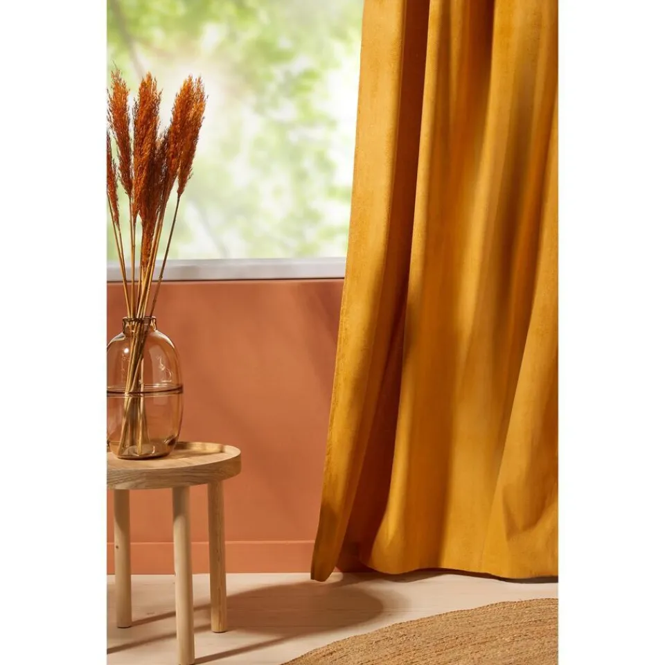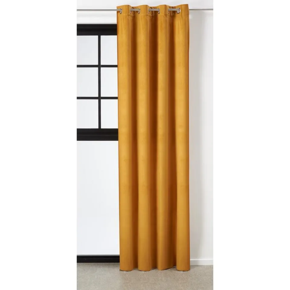 Kant en klaar ringgordijn van stevige okerkleurige stof. Soepelvallend en kreukherstellend. 135 cm breed.