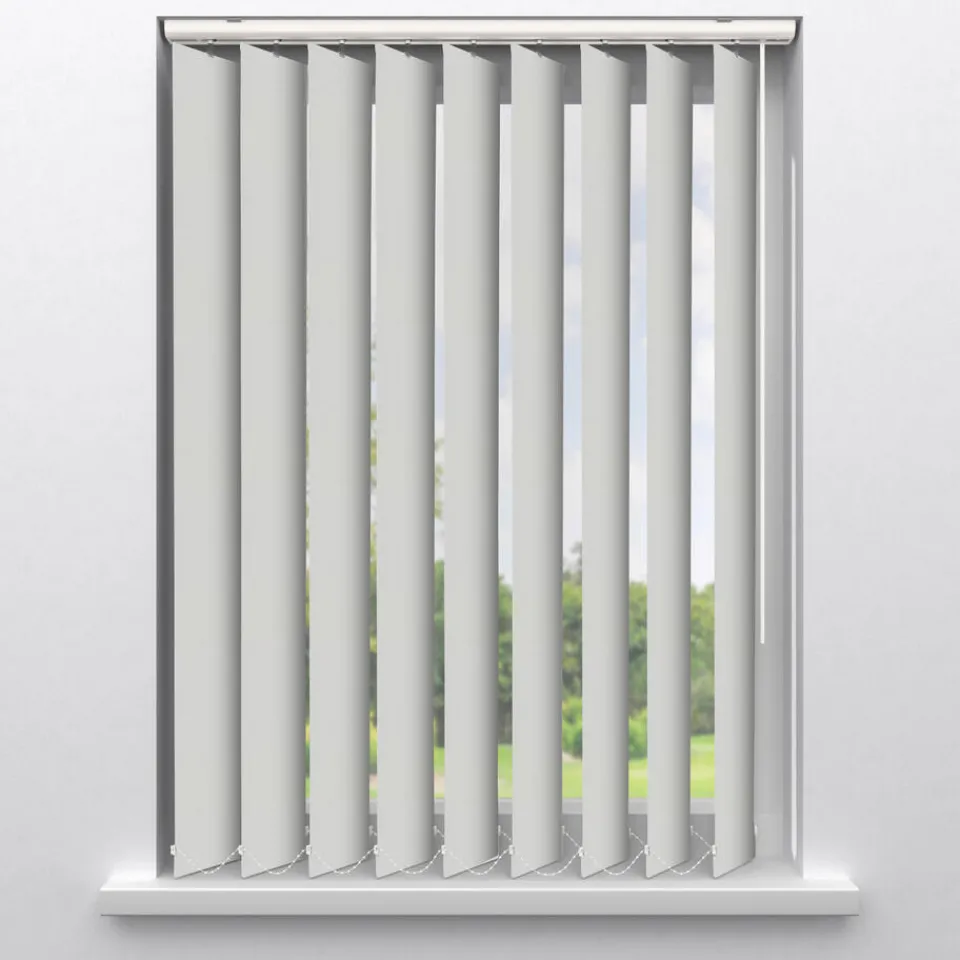Verticale lamellen van grijs PVC. De lamellen zijn 9 cm breed. De syteemkleur en de tuimelstok zijn wit. Kies zelf aan welke zijde je de lamellen wilt bedienen en bepaal eenvoudig de mate van lichtinval. De lamellen zijn vochtbestendig, eenvoudig schoon te maken en ook te gebruiken voor keukens en slaapkamers. Op maat te maken en met de juiste afmetingen te bestellen.