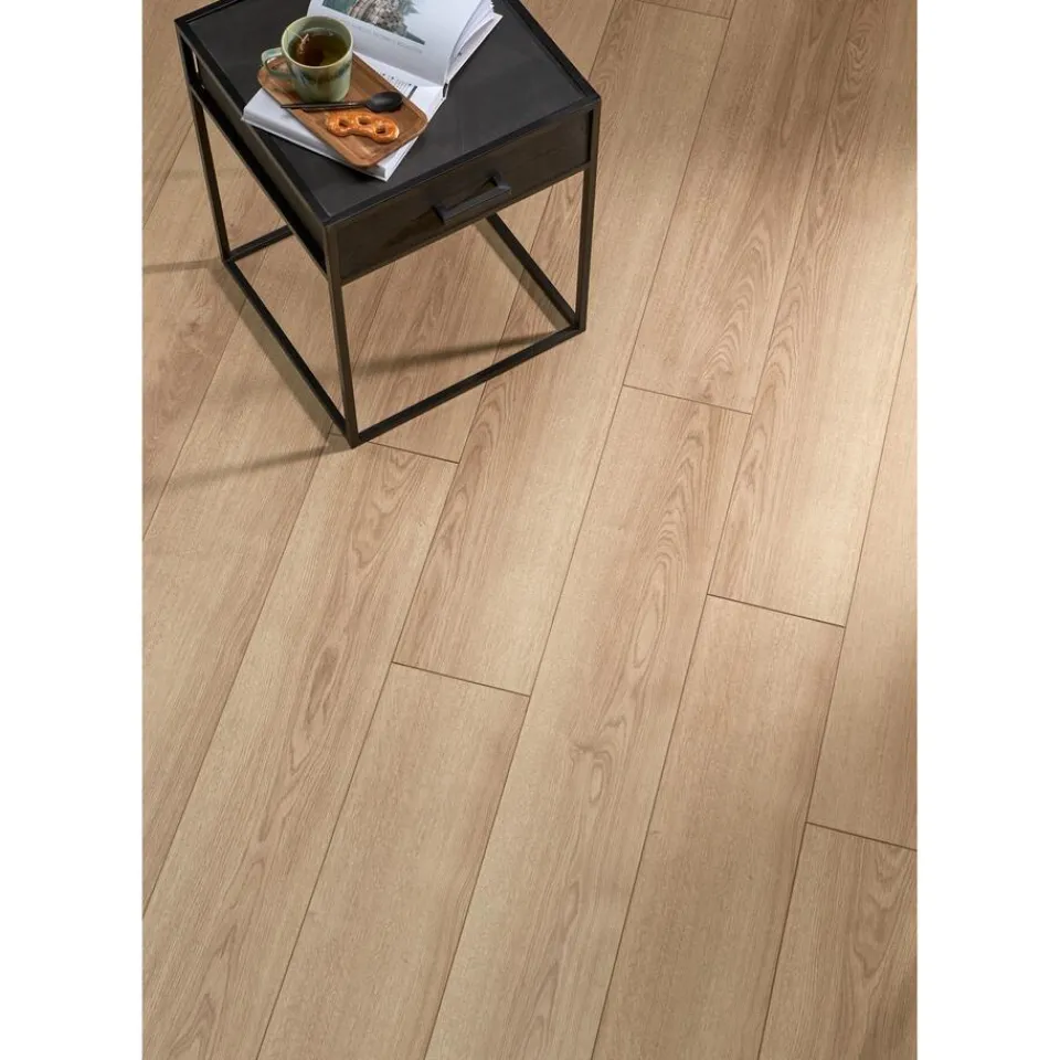 Laminaat Hunt met een dikte van 7 mm en een 4-zijdige V-groef. Inhoud per pak: 2,25 vierkante meter. Kleur: eiken.