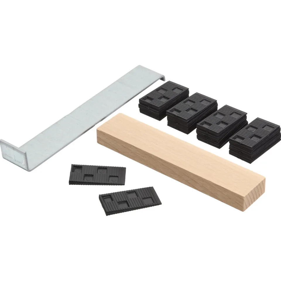 Laminaat legset 3-delig. Hielijzer, aanslagblok en 20 afstandspietjes voor het leggen van laminaat/parket.