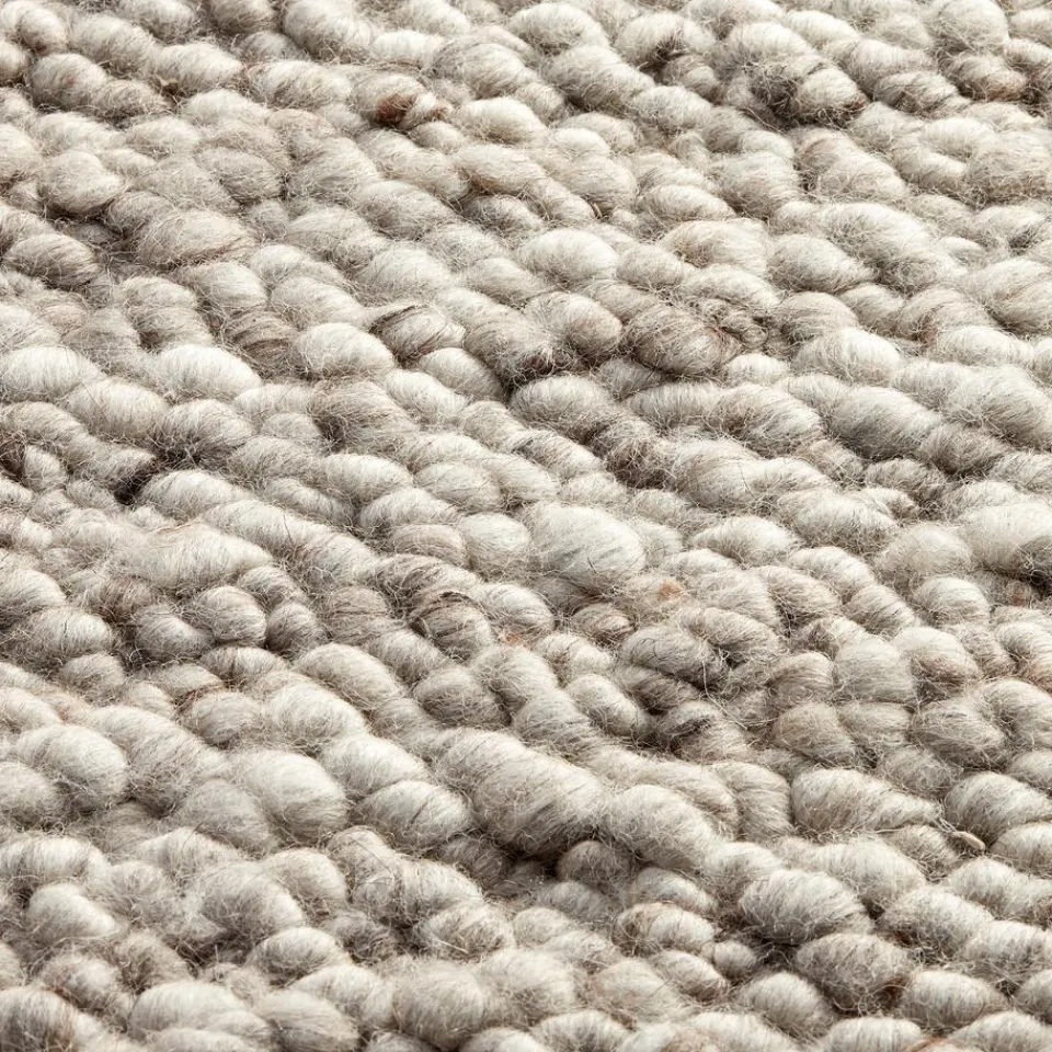 Handgemaakt bouclé vloerkleed van lichtgrijs gemêleerd wol. Veerkrachtig, geluiddempend en makkelijk in onderhoud. 160×230 cm (bxl).