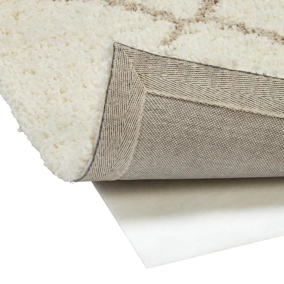 Vloerkleed in beige kleur met ruit patroon. Veerkrachtig, kleurvast en voelt zacht aan. Voorzien van het Care & Fair keurmerk. 230×160 cm (lxb).