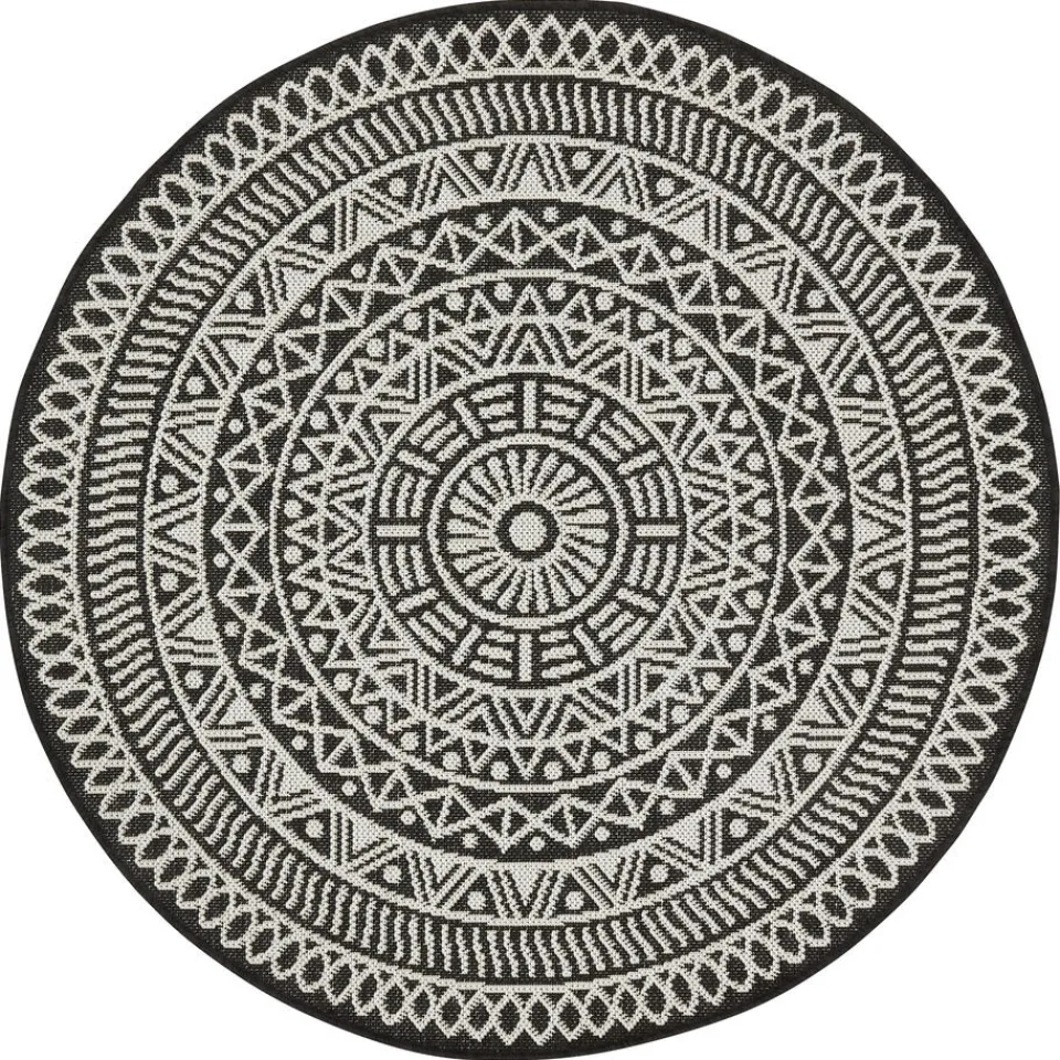 Rino is een rond vloerkleed die stijl en warmte toevoegt aan elke kamer. Met zijn zwarte kleur en opvallende Aztec print geeft dit vloerkleed een eigentijdse touch aan je interieur. De laagpolige textuur zorgt voor comfort en maakt dit kleed perfect geschikt voor drukbezochte ruimtes.