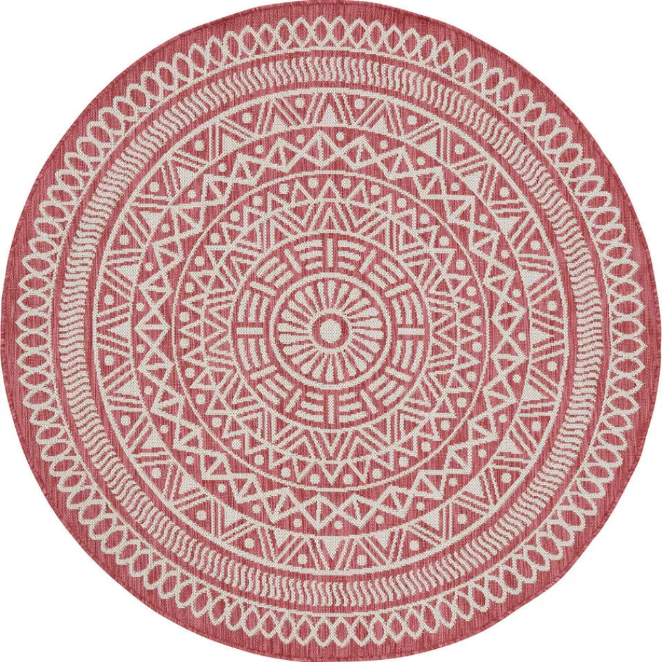 Rino is een rond vloerkleed die stijl en warmte toevoegt aan elke kamer. Met zijn roze kleur en opvallende Aztec print geeft dit vloerkleed een eigentijdse touch aan je interieur. De laagpolige textuur zorgt voor comfort en maakt dit kleed perfect geschikt voor drukbezochte ruimtes.